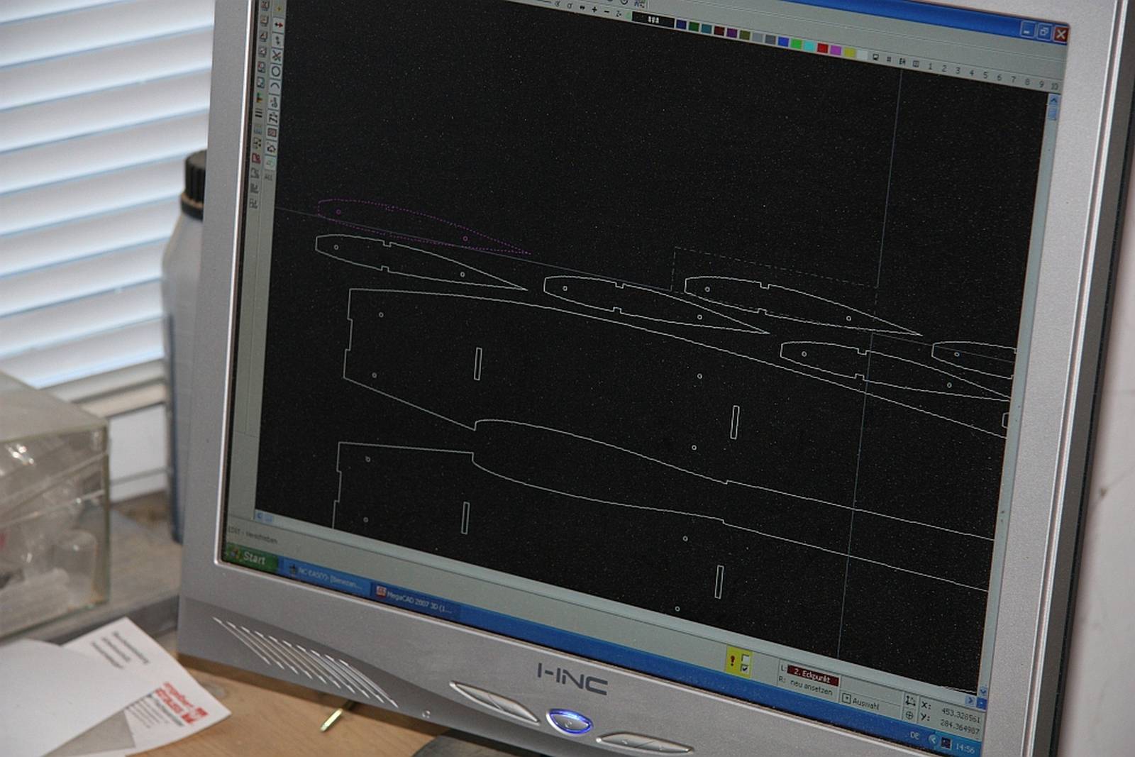 Nachdem Thomas und Lars einige Gnumpf Baupläne aus dem Internet geladen hatten, machte sich Axel daran, daraus eine Fräsdatei zu erstellen und im 3D Programm die Maße zu überprüfen. Anschließend wurden alle Teile auf Axels CNC-Fräse zur Probe aus günstigem Sperrholz gefräst und zusammen gefügt. Alles passte auf Anhieb und alles ist für den ersten Vorseriengnumpf vorbereitet.